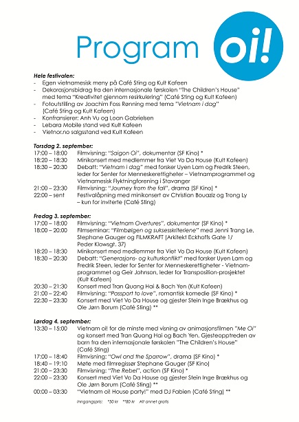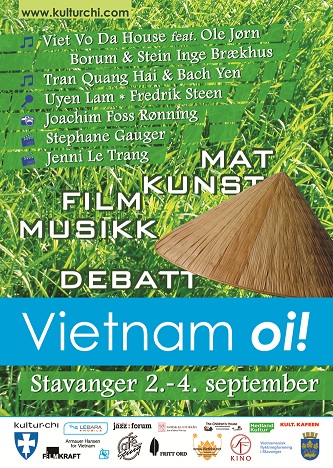 In the Western Norwegian town of Stavanger, however, the Vietnamese society welcomed the idea, and supported the organization of a Vietnamese culture festival. Terje Vallestad, owner of Sting Café, a meeting place for many cultural activities in the town, became the third partner, and a festival program was developed, with support from several organisations and institutions in Stavanger, as well as financial support from the organization Fritt Ord, the Norwegian Cultural Council and local municipalities. The program included film screenings, art exhibitions, Vietnamese food served at Sting, concerts and debates. Guests were the group Viet-Vo-Da-House, who participated in a workshop and performed with the Norwegian musicians Ole Jørn Borun and Stein-Inge Brækhus, concerts with Tran Quang Hai & Bach Yen, participation by film makers Jenni Trang Le and Stephane Gauger, photo exhibition by Joachim Foss Rønning and more.