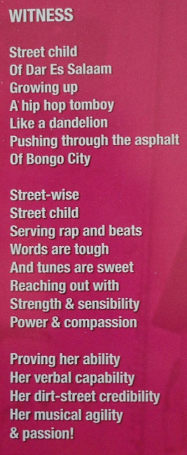 Witness used to be one of the toughest ones, the only girl in an all male rap and hip hop commjunity in the streets of Dar Es Salam. Just before the start of the second millennium she met up with Sigbjørn Nedland of Nedland Kultur. She was hanging around Marimba studio, the recording studio in Dar Es Salaam started by Nedland Kultur and partners in 1998. A recording with the Mradi Band was ongoing, and she asked “Can I come in and watch?” She could, and when asked by Sigbjørn what she was doing, she told him “I’m a rapper”. He asked her to show what she could do, and was impressed enough to offer her (for free) a few studio days with a producer/engineer, during which she produced two songs. One of them got quite some radio play on local stations. From there she slowly started growing her carreer, and eventually joined the group Wakilisha, with whom she won the East Africa Coca Cola Popstars.
