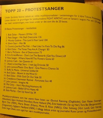 To celebrate the 10th anniversary of the Protest Fesvial, festival director Svein Inge Olsen challenged some of Norway’s top music journalists in the major national media to vote for their favorite protest songs of all time. The resulting list contained 100 songs, and the top 20 are found on the “Fight Apathy” album. In addition to new versions of these 20 classic protest songs by a combination of top Norwegian and international artists, the album also contains some new compositions and versions of songs by artists who have been especially supportive of the Protest Festival and who support the ideals of the festival.