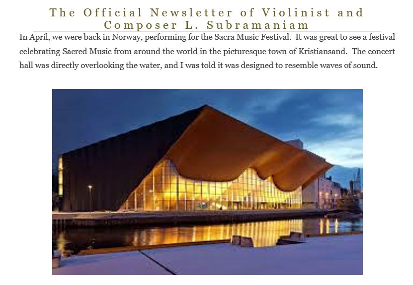 In 2014 Nedland Kultur was approached by Bentein Baardson and Håkon Berge at Kilden, the concert-, theatre- and opera house of Kristiansand, Norway, with an invitation to take part in the planning and programming of a “Sacra Art” Festival, featuring religious music from various countries and cultures. The main contribution from Nedland Kultur was a specially comissioned concert by Indian violin virtuoso and composer Dr. L. Subramaniam and his family: Sacred Ragas, curated and coordinated by Sigbjørn Nedland, in close collaboration with Dr. L. Subramaniam.