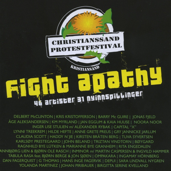 Fight Apathy is at the same time an international and a Norwegian music production. Some very profiled international artits participate, like Barry McGuire, Kris Kristofferson, Delbert McClinton, Roger McGuinn and Mick Fleetwood, but 28 out of the total 37 tracks on the double album are by Norwegian artists. These include top names in Norwegian music, like Åge Aleksandersen, Anne Grete Preus, Jonas Fjeld, Jan Eggum and many more. Some of them perform old protest songs in the original language, some sing Norwegian language versions, and all of them highligh the role of music as a medium of social and political comment and protest.