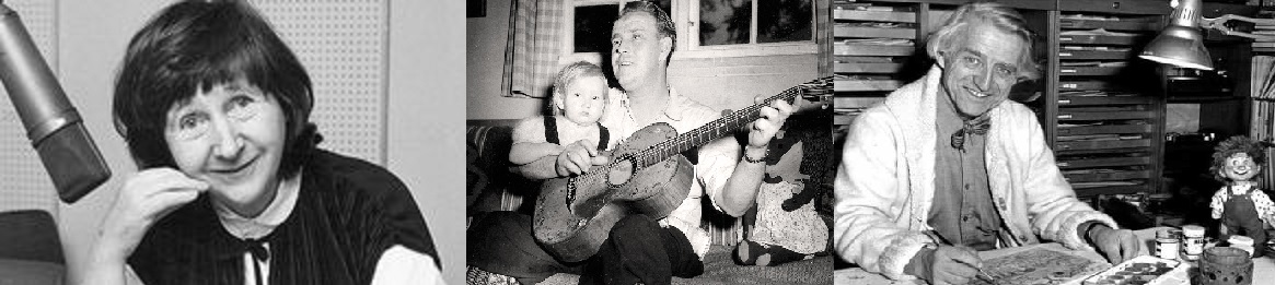 From left: Anne Cath Vestly, Alf Prøysen, Torbjørn Egner – three of the biggest profiles of “Barneteimen for de minste” . Right: Kids listening to Barnetimen for de minste. A survey in 1953 showed that 94% of Norwegian children listened to the show!