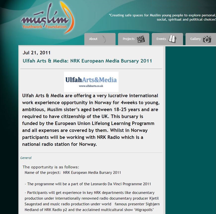 A chance meeting at WOMEX in Sevilla between Naz Koser, founder of Ulfah Arts, and Sigbjørn Nedland, founder of Nedland Kultur, sparked the idea of a collaboration. The idea was to help develop media awareness and a dedication to journalism in the clientele of multi-ethnic youth that had been recruited to the Ulfah Art center in Birmingham. This center was started to give inspiration and help to youth whose background was giving some challenges in their meeting with British society. Naz Koser started working with young girls in muslim communities, getting permission to use schools during afternoons and evenings for activities and training in arts, music etc. Then her initiative grew, and eventually became an art center offering activities for a group of young people. There was a common understanding between the two founders that this group of young people, many of them British muslim girls, are grossly under-represented in the media. They decided to try to do something to let some of them get a chance to learn media skills, and maybe become a voice in media for their community. Nedland approached NRK, where he was at the time running a radio show of global music called Jungeltelegrafen, offering to coordinate an exchange, and to offer training to youths from Ulfah Arsts as reporters for this show. NRK’s Culture Department responded positively, and with support from EU via the Leonardo Program (a program designed to build a skillful workforce through European Partnerships), the project became reality.